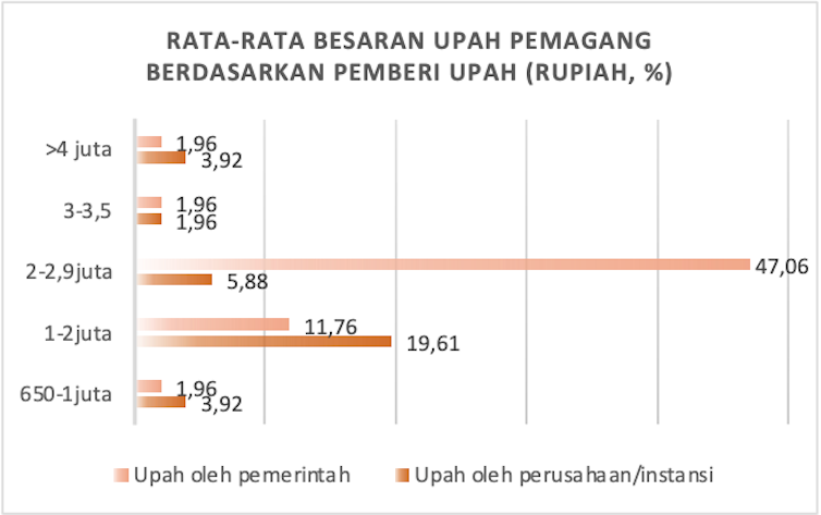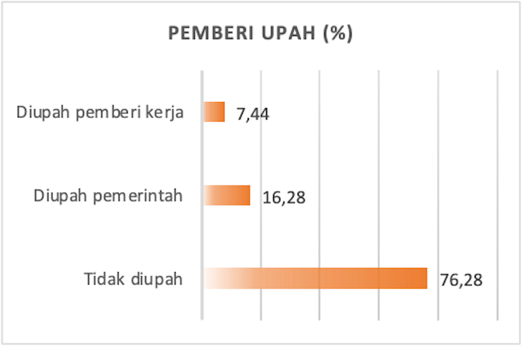 Banyak dari mereka harus mengandalkan “kebaikan hati” pemberi kerja untuk memberikan upah. Misalnya, hanya 23,72 persen responden pemagang akademik menyatakan menerima upah.