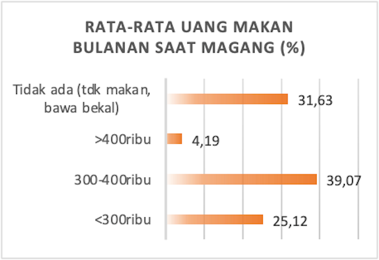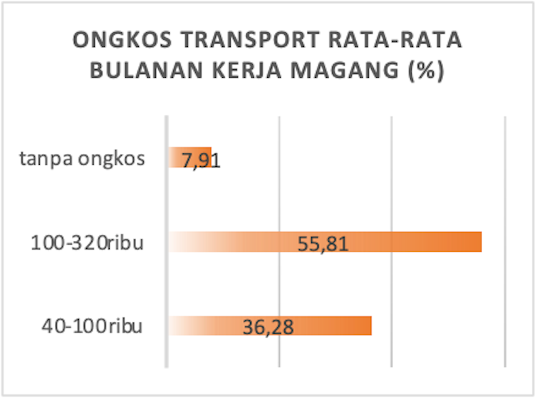 Padahal, banyak pemagang harus menanggung ongkos transportasi dan uang makan sebesar Rp400-720 ribu per bulan. Banyak dari mereka membayar bahan bakar kendaraan dan banyak pula yang menggunakan moda transportasi umum untuk pulang dan pergi magang.